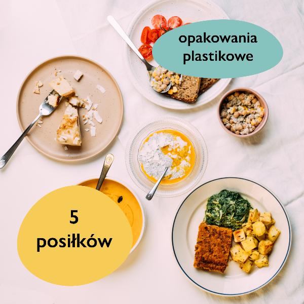 5 roślinnych posiłków: śniadanie, zupa, obiad, deser i kolacja, czyli 2000kcal i ponad 7 porcji warzyw i owoców. Zero myślenia o zakupach, wymyślania potraw czy gotowania, za to pewność, że zjesz zbilansowane, zdrowe i różnorodne posiłki przygotowane od serca. Wariant w plastikowych pudełkach.